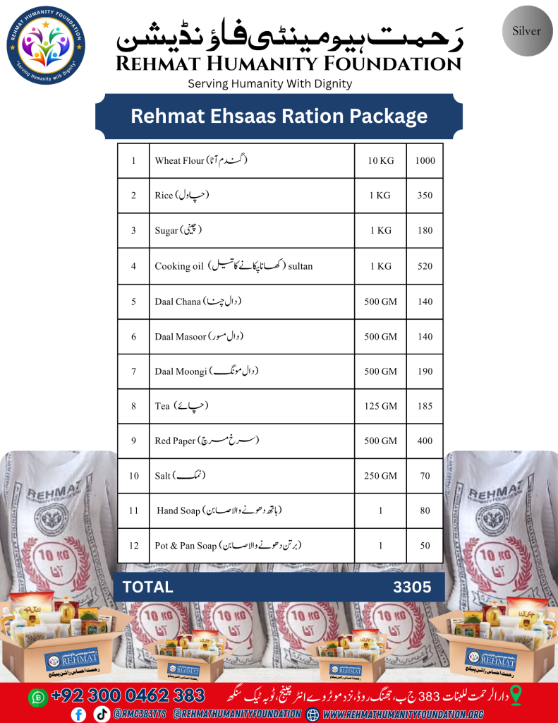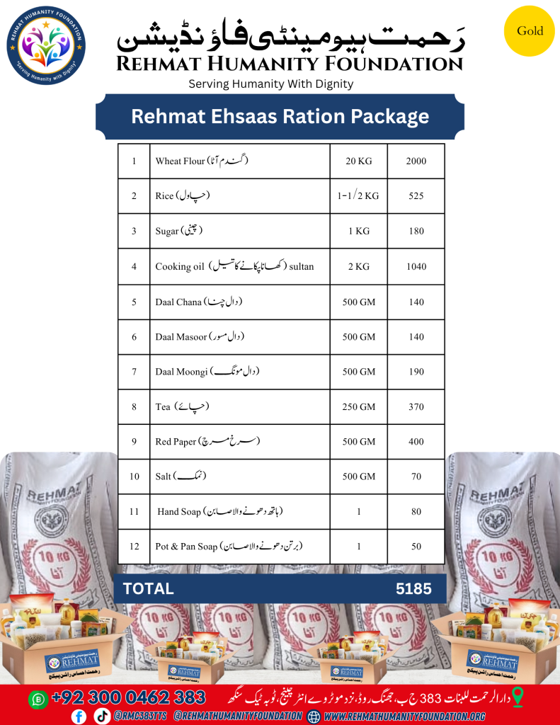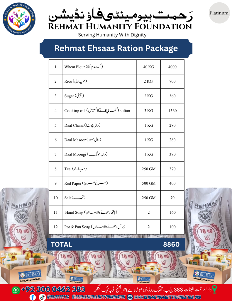The Rehmat Ehsaas Ration Program is a charitable initiative of the Rehmat Humanity Foundation, dedicated to providing essential food supplies to orphans, widows, and disabled individuals. The purpose of this program is to ensure that no deserving family sleeps hungry and that every home receives the basic necessities required to live with dignity.