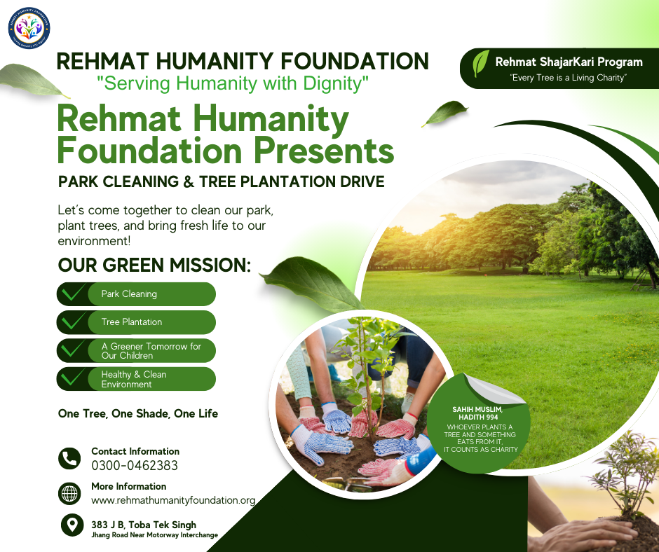 At Rehmat Humanity Foundation, we believe that caring for the environment is a vital part of serving humanity. The Rehmat Shajarkari Program is our tree plantation initiative, aimed at creating healthier, greener, and cleaner communities.